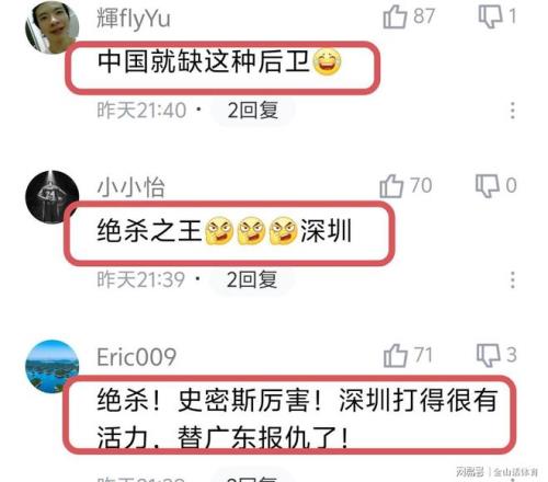 23岁的小外援史密斯,本赛季持续出色的发挥,以及本场比赛抢眼的表现,令网友们赞不绝口,纷纷留言道“这球太精彩了,看看人家的外援,北京选的什么外援,差距太明显了!”;“绝杀反绝杀,真精彩.”;“中国就缺这种后卫”;“绝杀之王,深圳!”;“绝杀!史密斯厉害!深圳打得很有活力!”;“最后一回合神仙打架,真特么过瘾”;“就看了个绝杀和反绝杀!!”;“把深圳这个小外援归化吧,还年轻可以用很久。”……
